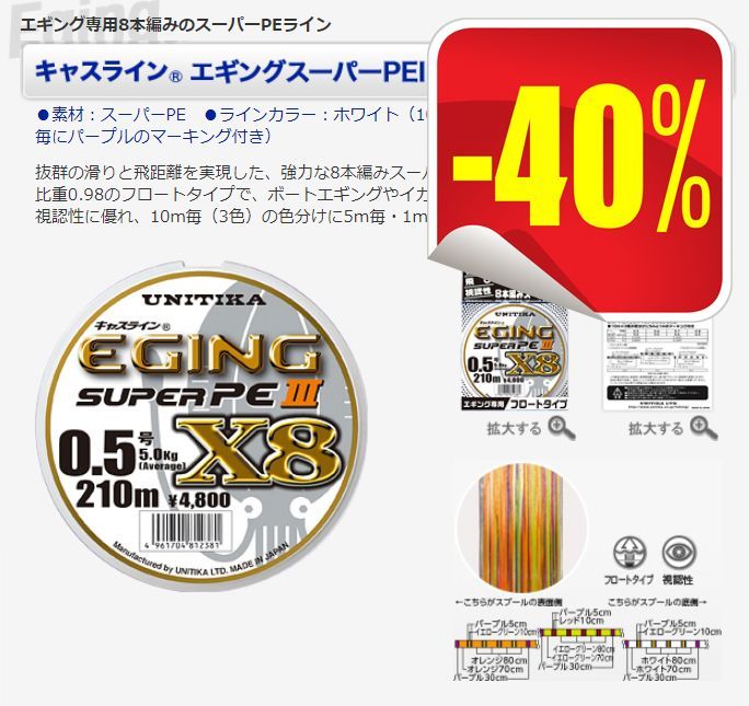ユニチカ キャスラインエギングスーパーpeiii X8 0 6 210m 40 Off エギングショップ Squid Mania