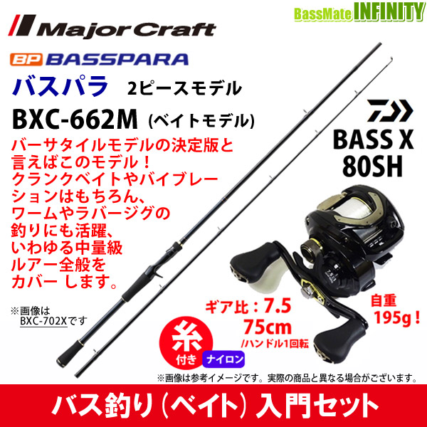 ナイロン12lb 約100m 糸付き バス釣り ベイト 入門セット メジャークラフト バスパラ 未使用品 Bxc 662m ダイワ バスエックス 80shl ベイトモデル Bass X 2ピース 左ハンドル
