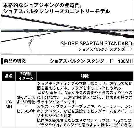 ダイワ(daiwa) ショアジギングロッド ショアスパルタン スタンダード 106m 釣り竿がジギングロッドストアでいつでもお買い得。当日お急ぎ便対象商品は、当日お届け可能です。アマゾン配送商品は、通常配送無料(一部除く)。. インプレショアスパルタン スタンダード106mh 17年04月25日. ショアスパルタンのシリーズでは最強強度を誇るロッドです。 自重は485gと重めの設計ではありますが、その分手に持った時の安心感が間違いなくあります。 ショアスパルタンなら超大物である㎏オーバーのヒラマサでも.