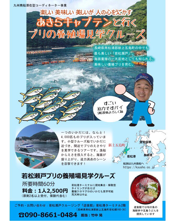 周南today على تويتر 本日はふるさと長崎市へ 五島列島航路会社 九州商船 のコーディネーター会議で あきらキャプテンと行くブリ の養殖場見学クルーズ を発表します 場所は長崎県新上五島町 若松瀬戸 本土から来た旅行者をターゲットにこの島